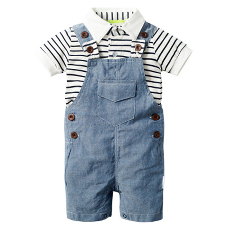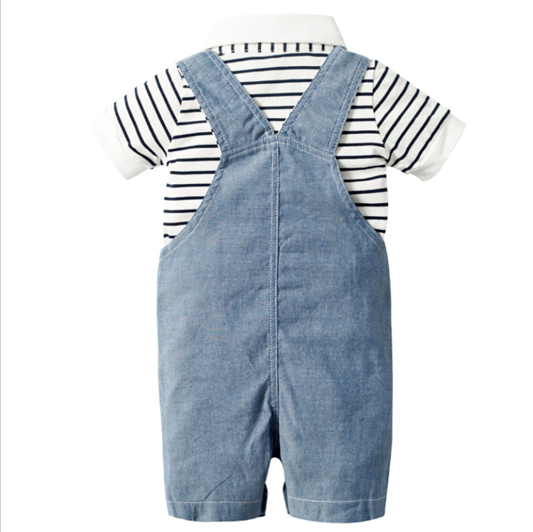 Baby boy cotton denim blue overall shorts, black and white polo shirts and denim blue hat 3 piece set