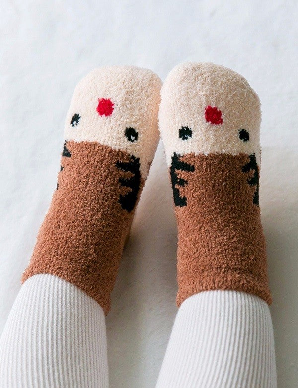 These warm and fuzzy Reindeer socks, are sure to make any munchkin smile and wiggle their toes, while keeping them toasty at the same time. The perfect holiday gift or stocking stuffer. See pictures for size chart.