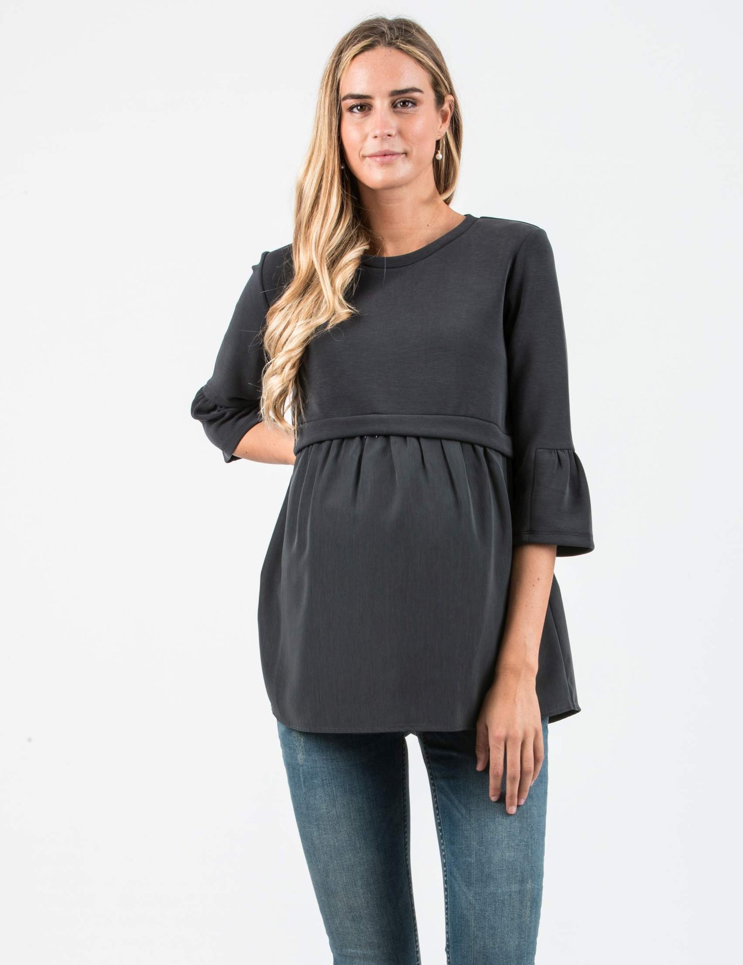 Practical maternity and nursing sweatshirt made in modal and satin with ¾ sleeves and round neckline. The bodice, in very soft modal fabric, perfectly hides an invisible horizontal zip that provides comfortable access for breastfeeding, while the lower section in flowy satin slides down the bump and offers a flexible fit during the whole pregnancy and postnatal. Perfect for an everyday look.