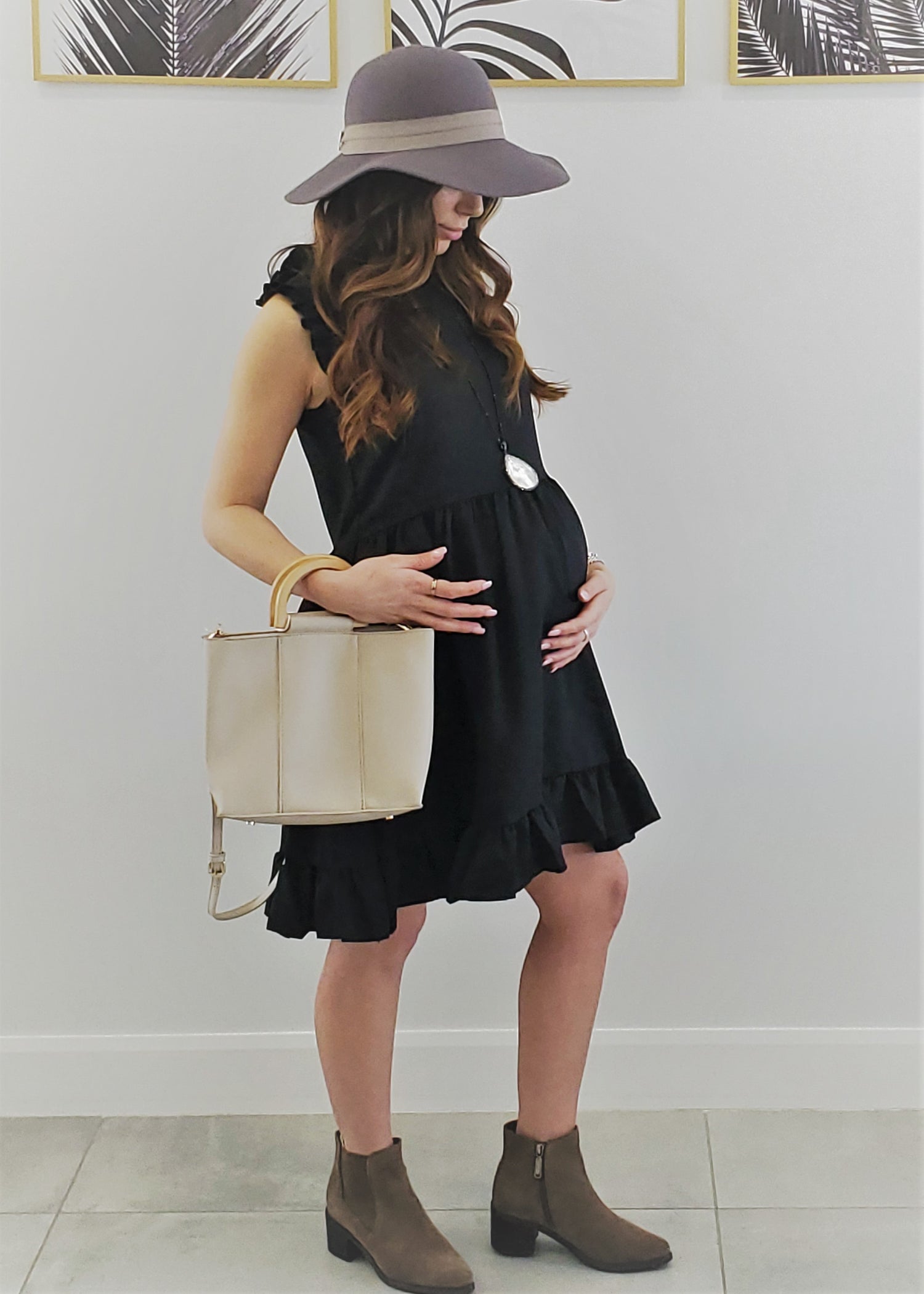 Women's Black Flowy Maternity & Post natal mini dress with ruffle hem and sleeves