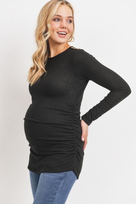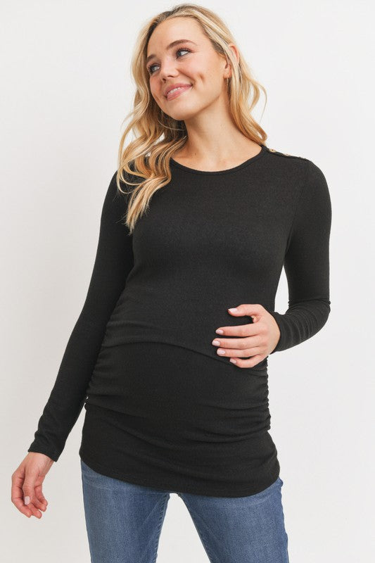 Women's black round neck long sleeve maternity & postnatal top with button detail on shoulders
