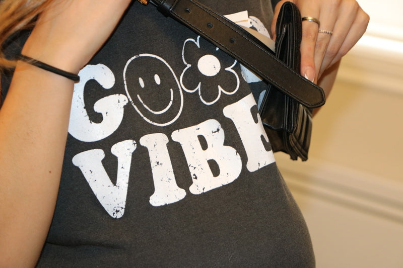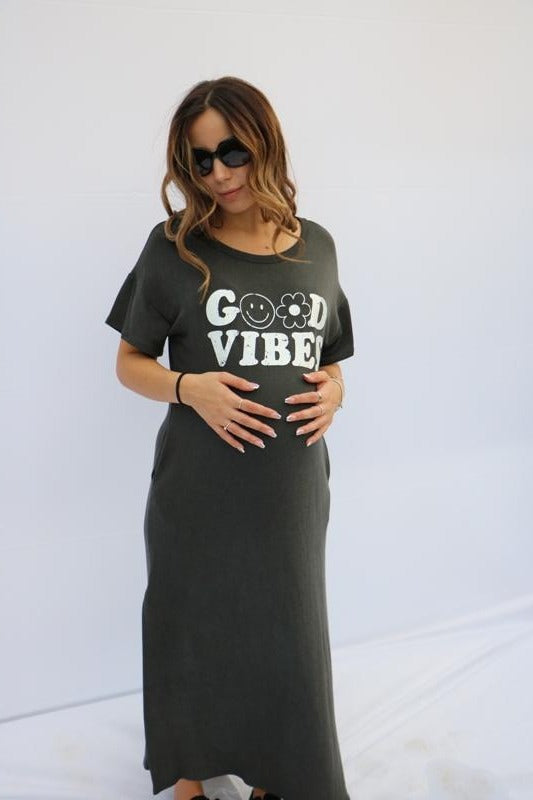 Women's solid dark grey maxi dress with side pockets and "Good Vibes" print