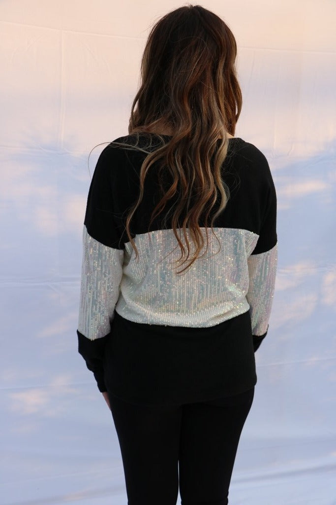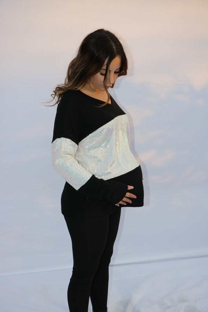 Long sleeve super soft V-neck top with mid off-white iridescent sequins. Perfect for everyday, with your favorite jeans or pants, as well as for your holiday parties, with a nice skirt.