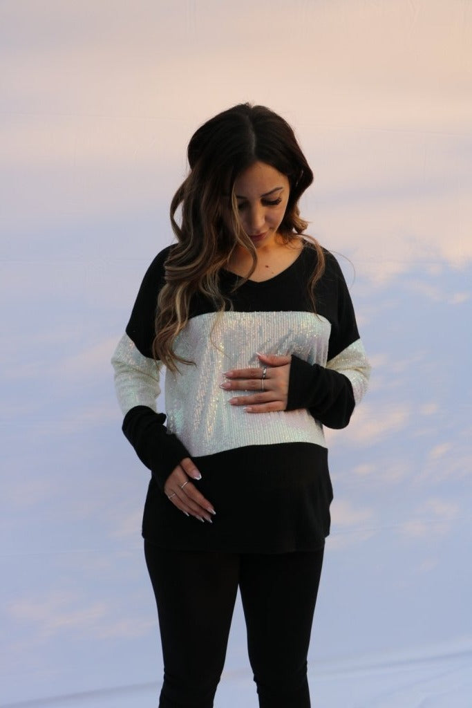 Women's black long sleeve soft v neck maternity & post natal top with sequins