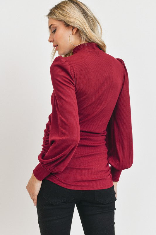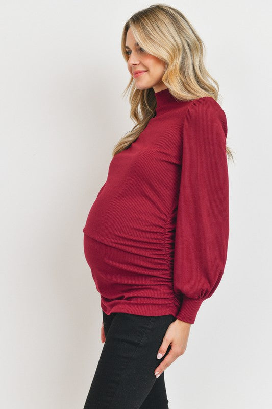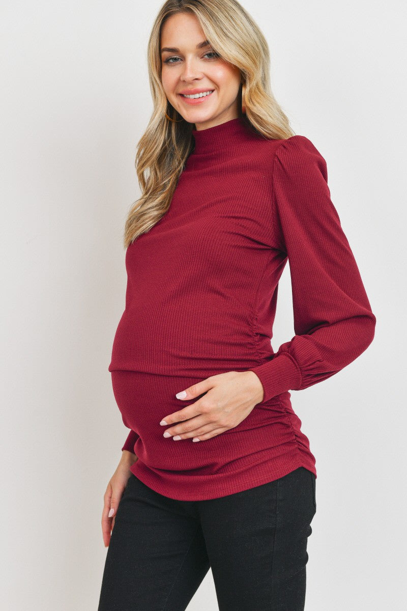 Women's Burgundy Puff Shoulder Ribbed Maternity Mock Neck Top