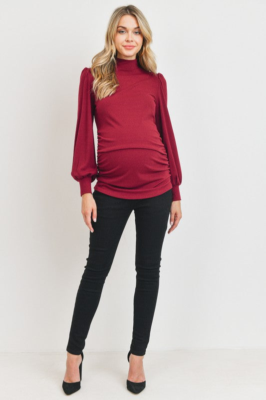 This ribbed mick neck balloon sleeve top is ideal for those Fall and Winter months. The side ruching allows for this top to grow with you throughout your entire pregnancy and shrink back down post-partum.