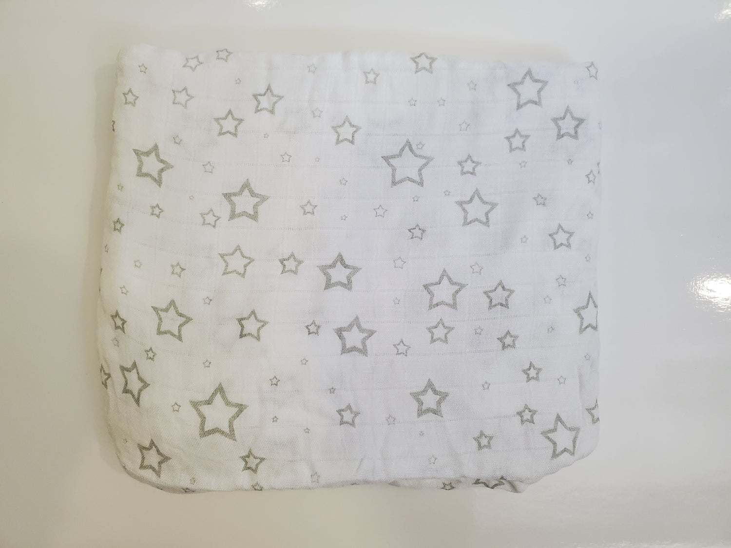Beautiful unisex bamboo muslin swaddle blanket with light grey stars.