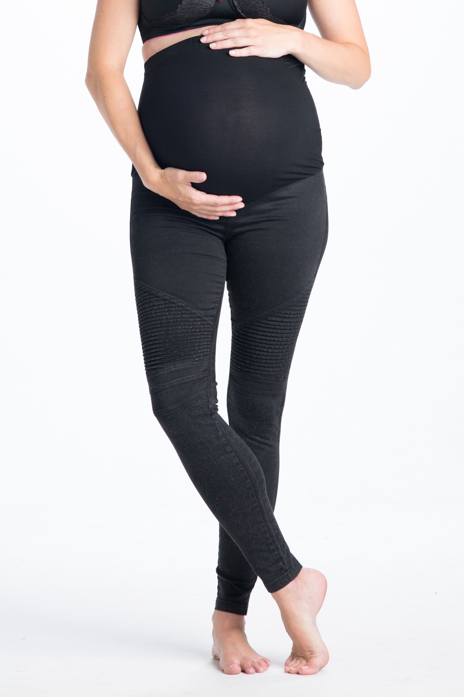 Women's Black Out Moto over the bump cotton maternity leggings with ribbing at knees