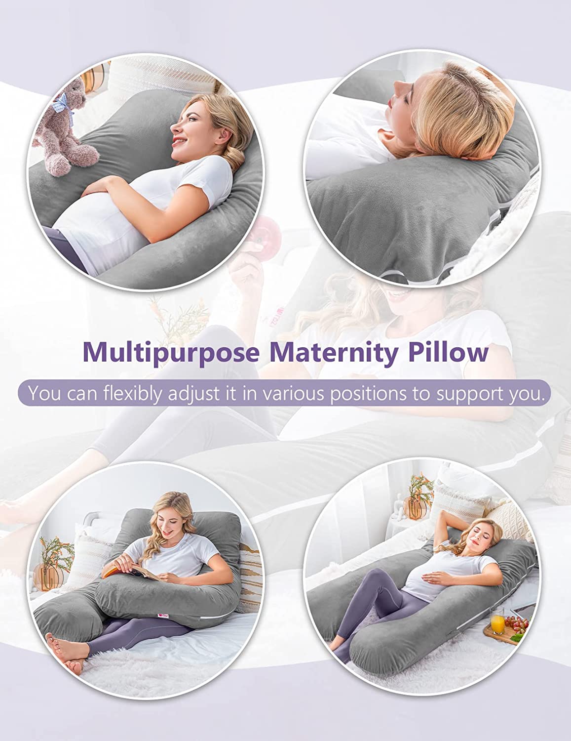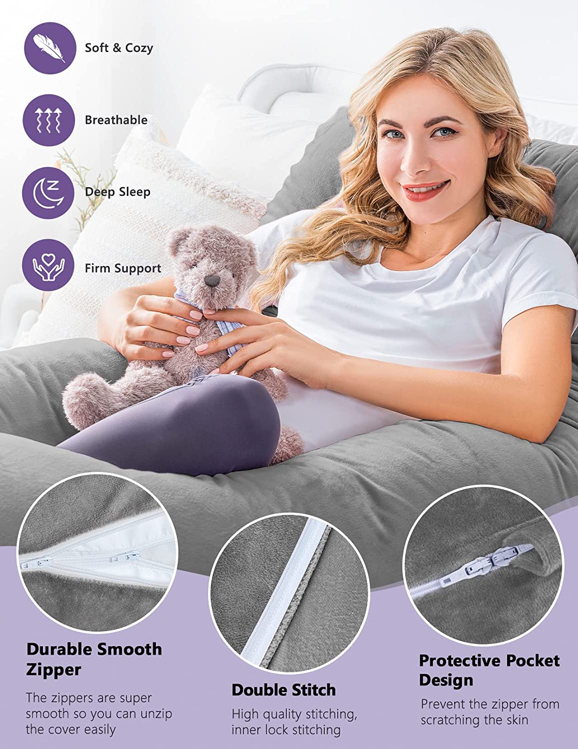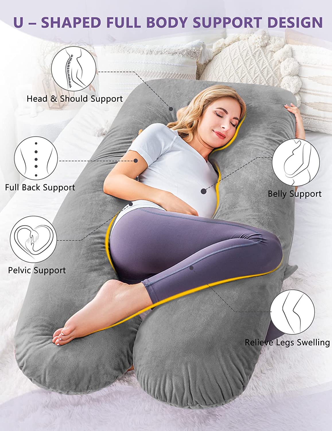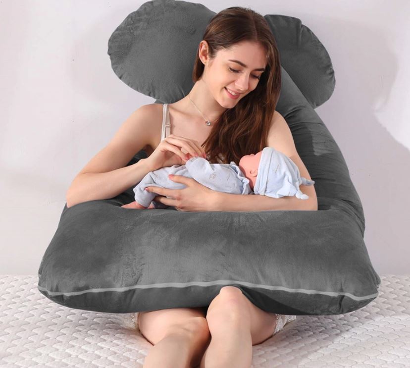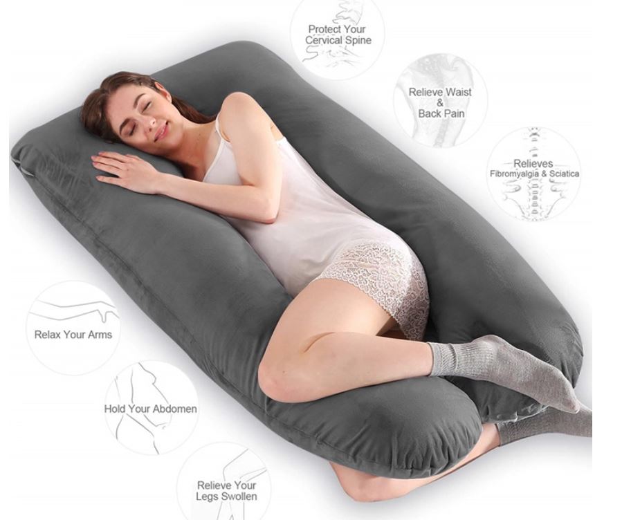 "U" shaped full body pillow with grey velvet removable and washable outer cover