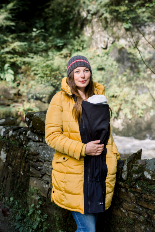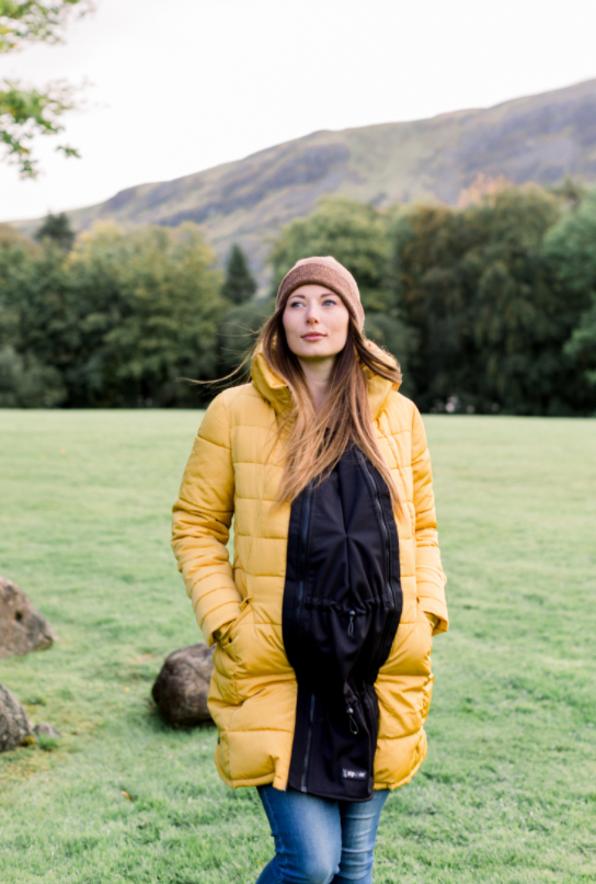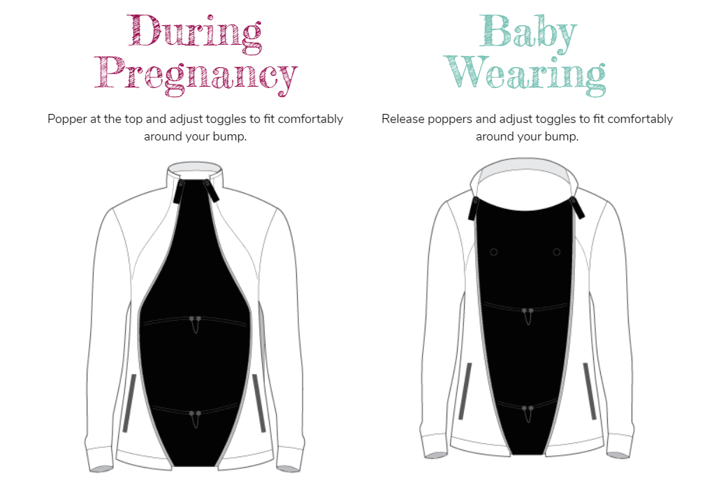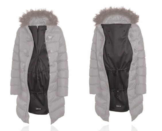 The award winning jacket extender panel from Zip Us In is a simple, fully adjustable, reversible, water and wind resistant panel that expands the jacket that you already love through pregnancy and when babywearing.