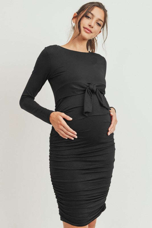 Round neck, knee length, super soft long sleeve maternity/ nursing dress with front knot and side ruching.