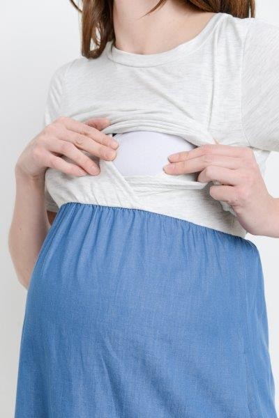 Women's light grey and denim blue round neck short sleeve maternity & nursing dress with side pockets