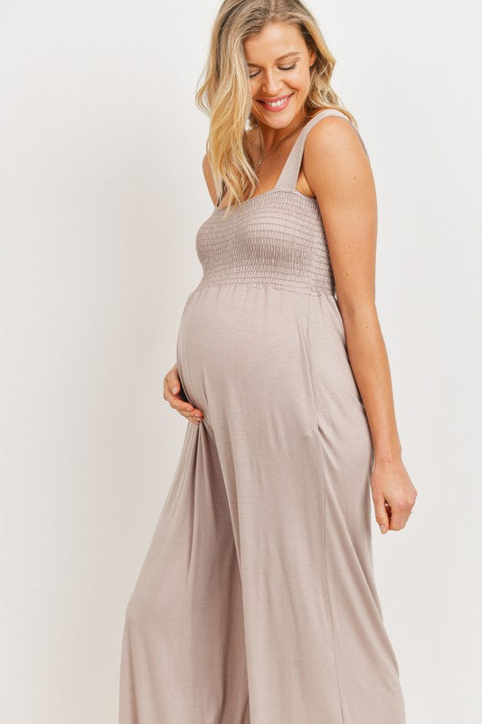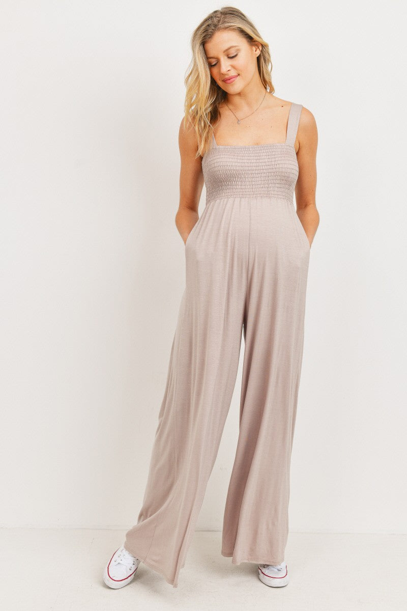 Women's taupe rayon square neck maternity & postnatal long jumpsuit with side pockets
